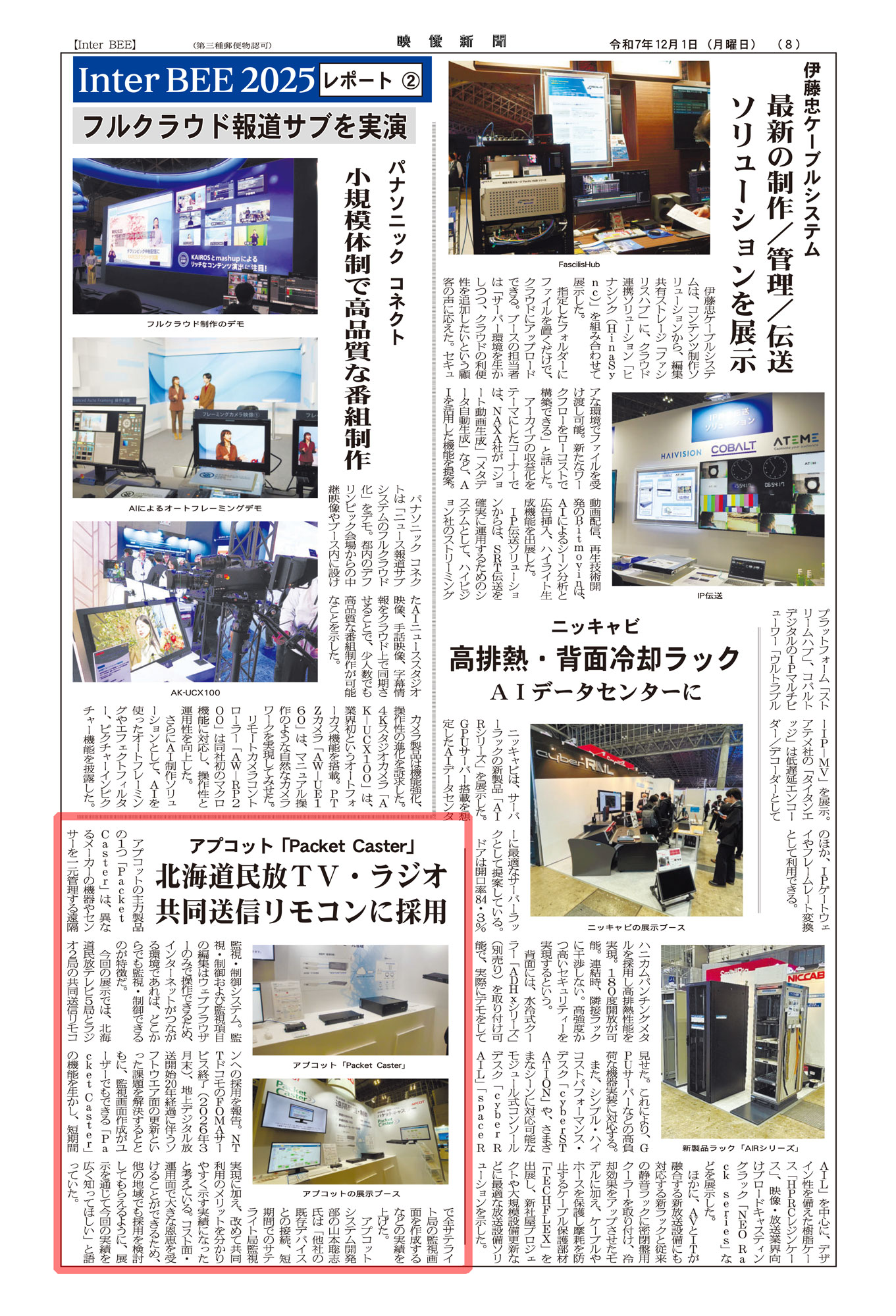 映像新聞 Inter BEE 2025レポートに Packet Casterが掲載されました Media 2026年01月26日 映像新聞社様 発行「映像新聞(2025年12月1日第2698号)」Inter BEE 2025レポート②にて、Packet Casterの特集記事が掲載されました。 2025年より北海道民放テレビ5局とラジオ2局の共同利用の遠隔監視制御システムとして、Packet Casterをご利用いただいております。 映像新聞 (2025年12月1日第2698号) 掲載記事(拡大) 映像新聞8面 (2025年12月1日第2698号)に 掲載 映像新聞社様 転載許諾済み 映像新聞社様 ウェブサイト