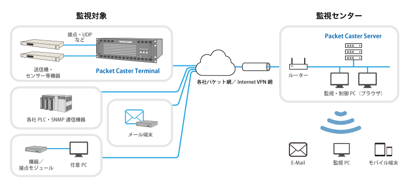 Packet CasterサーバーとPacket Caster端末によって構成され、異なるメーカーの様々な機器やセンサーを一元管理できるM2Mシステムです。監視・制御および監視項目の編集はWebブラウザのみで操作しますので、インターネットさえつながれば、どこからでも監視、どこからでも制御できます。